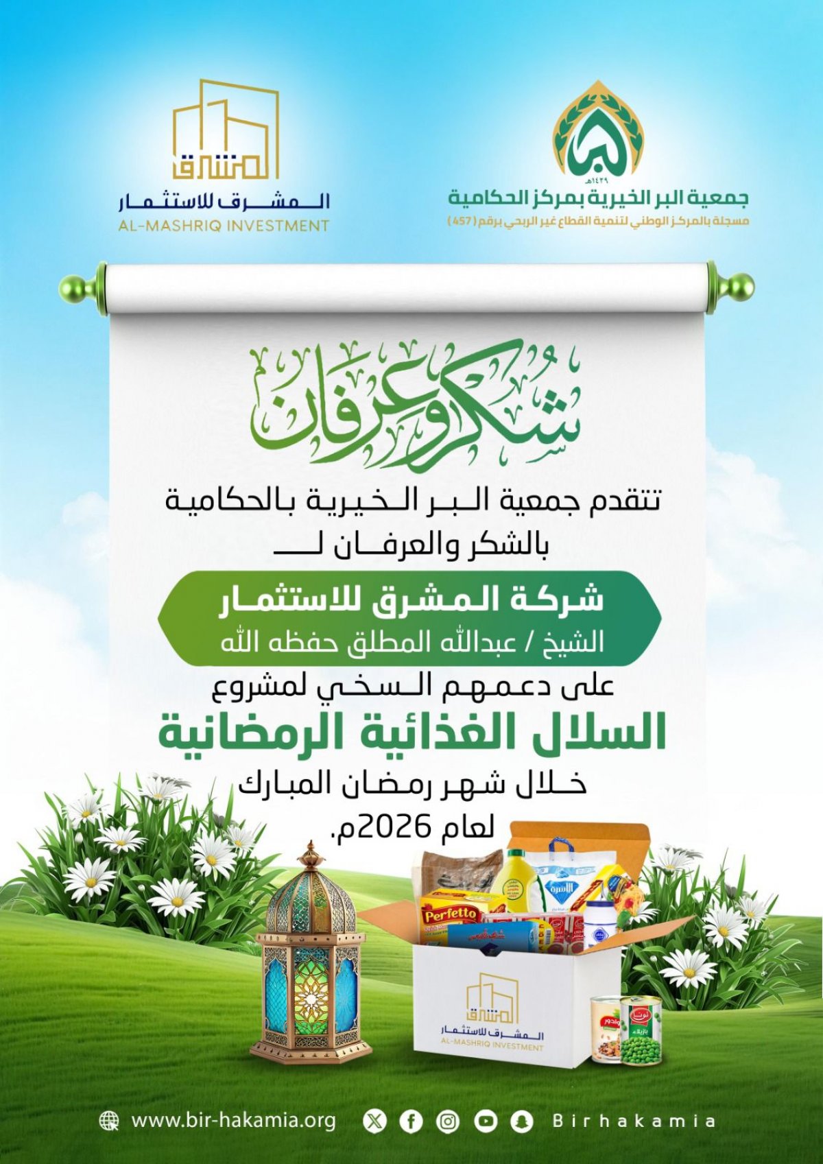 جمعية البر الخيرية بمركز الحكامية وبدعم سخي من شركة المشرق للاستثمار